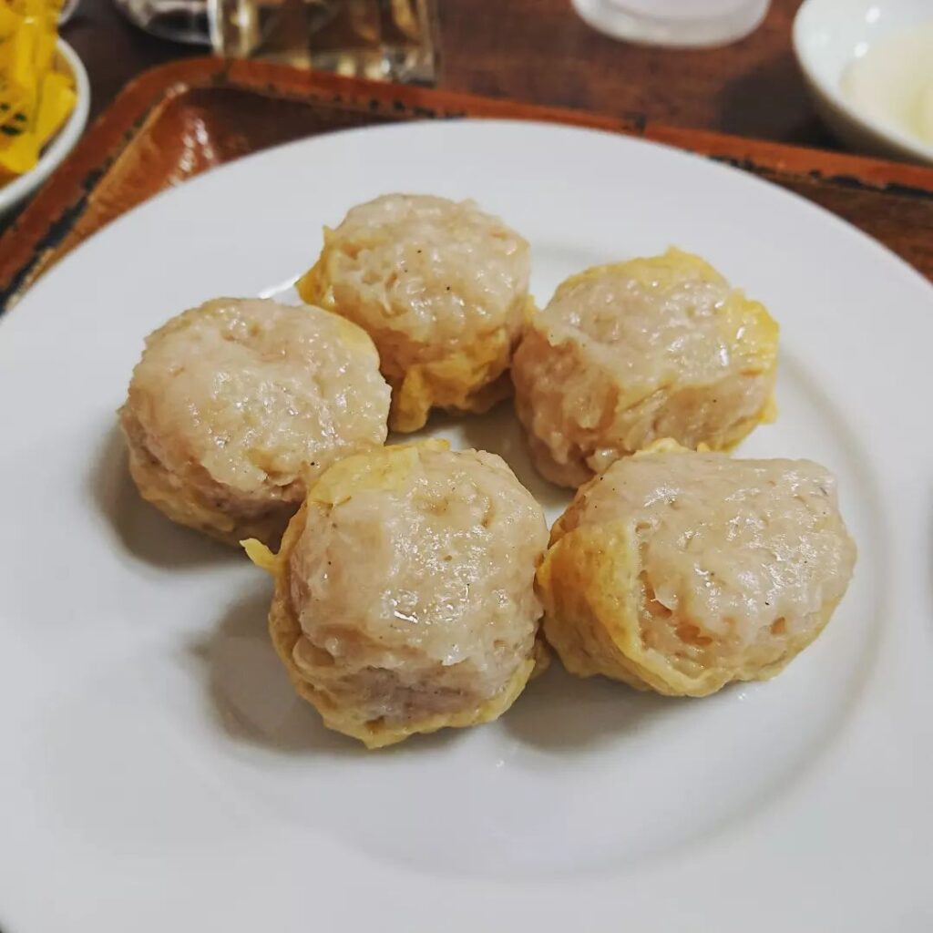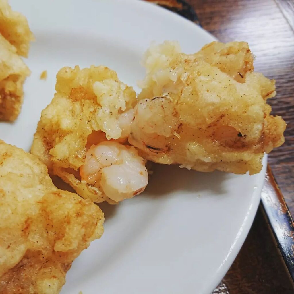 一芳亭、船場: エビ天定食シュウマイ付き 950円: 今日も行列に並ぶ前に滑り込みセーフ。ここのエビ天は、一見大ぶりのエビ天五個に見えますが、実は一つの固まりに小エビ十匹ほどまとめて揚がています。プリプリでうまい!