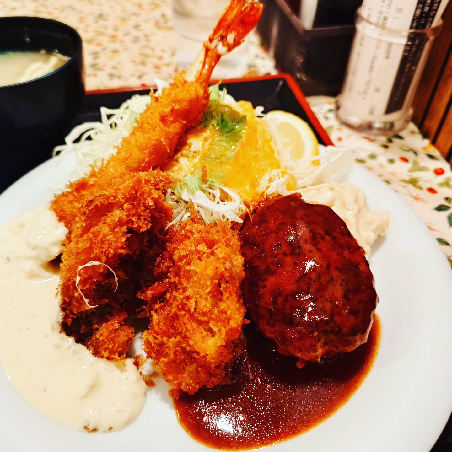 カキフライ2個、エビフライ1尾、合挽ハンバーグ。