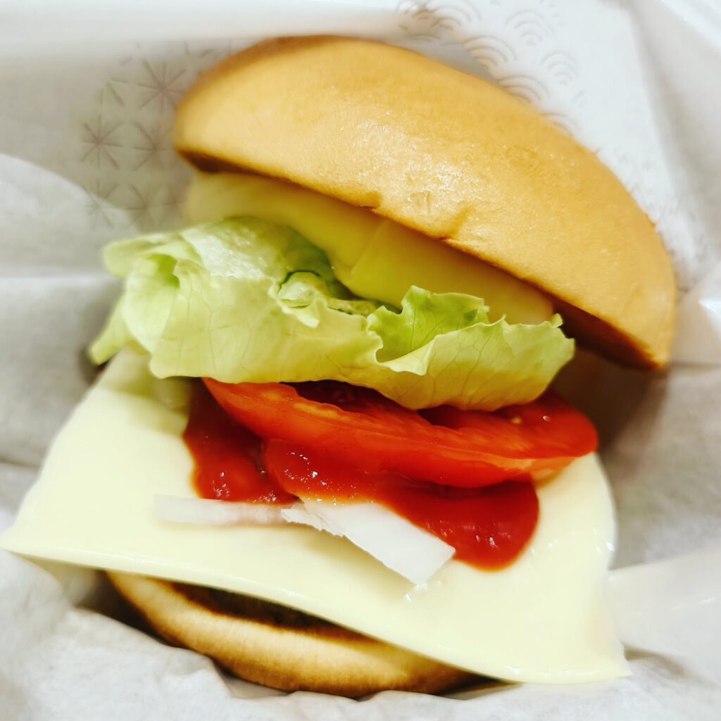 今日も朝からモスのハンバーガーは作りたてで、いつものようにぱっくり開いてます。