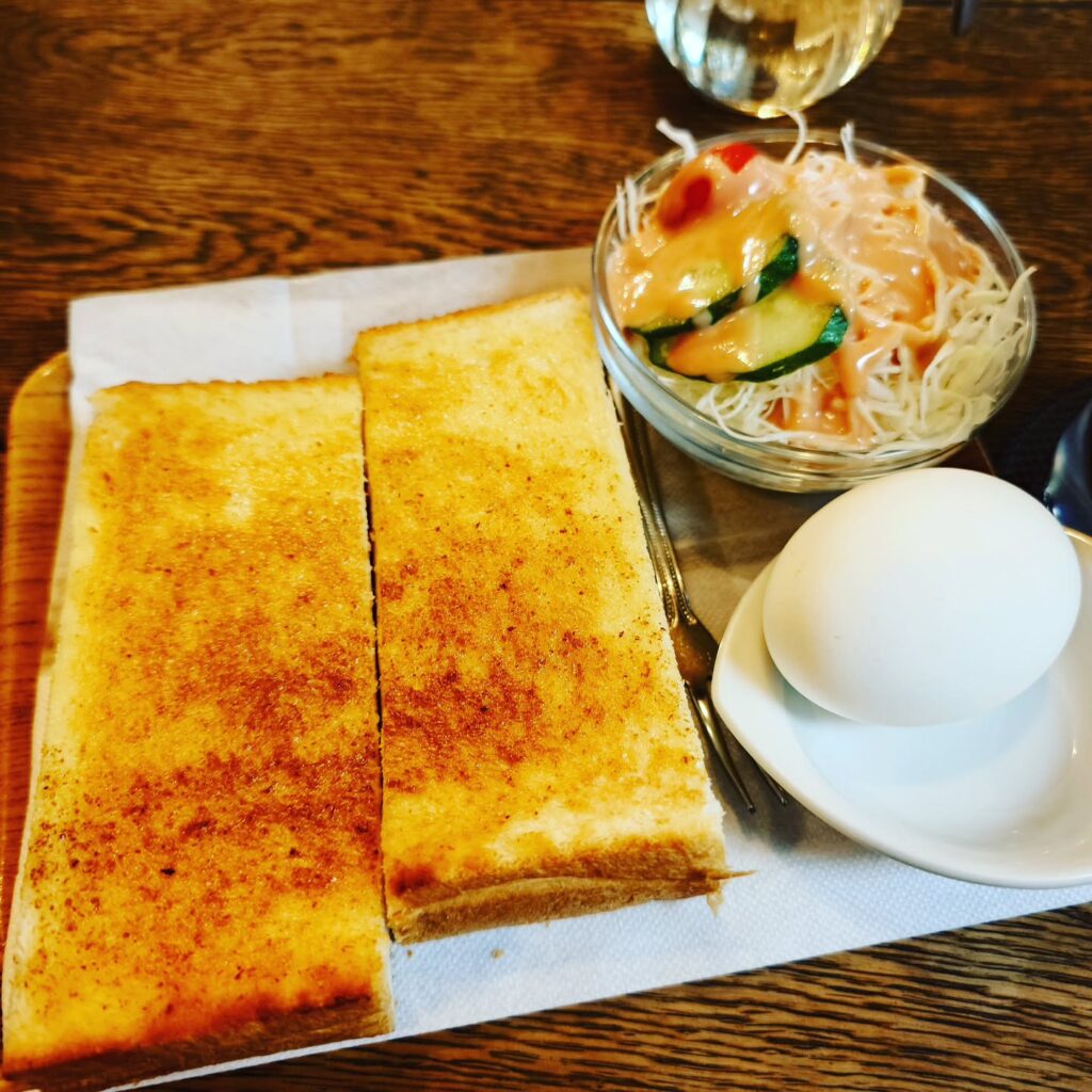 厚切りトーストとゆで卵、サラダのバランスもGood。