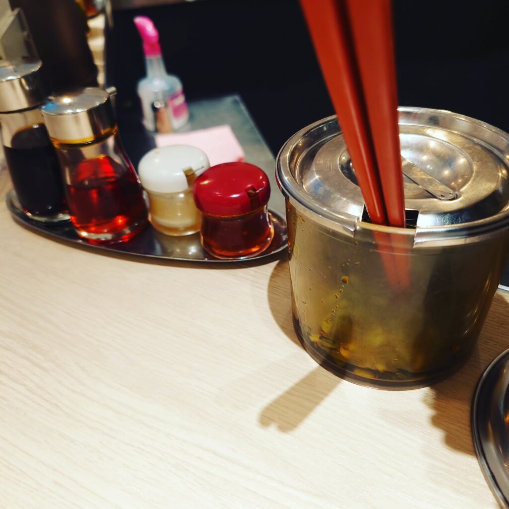 テーブル上にある取り放題のニラと豆板醤を入れる味変は、毎回の定番作業。