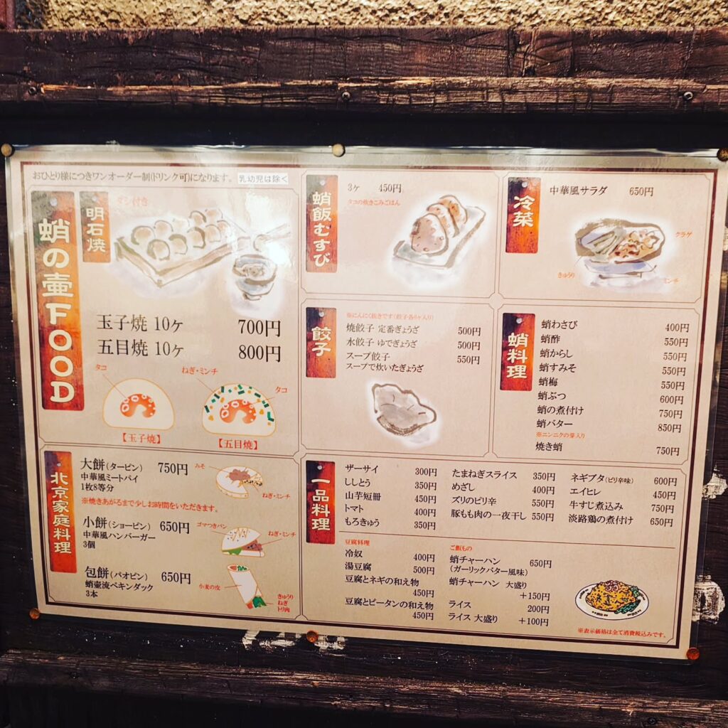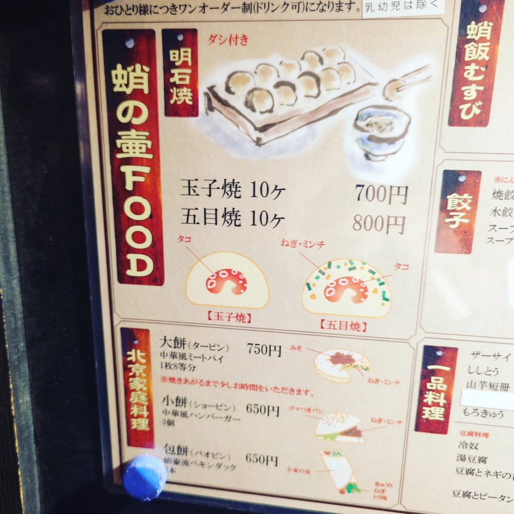 蛸の壺はその名のとおり、蛸料理、特に明石焼きを食べられるお店です。