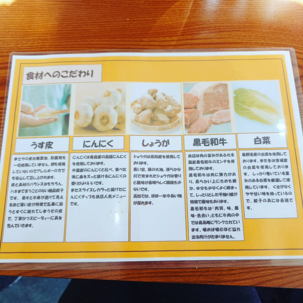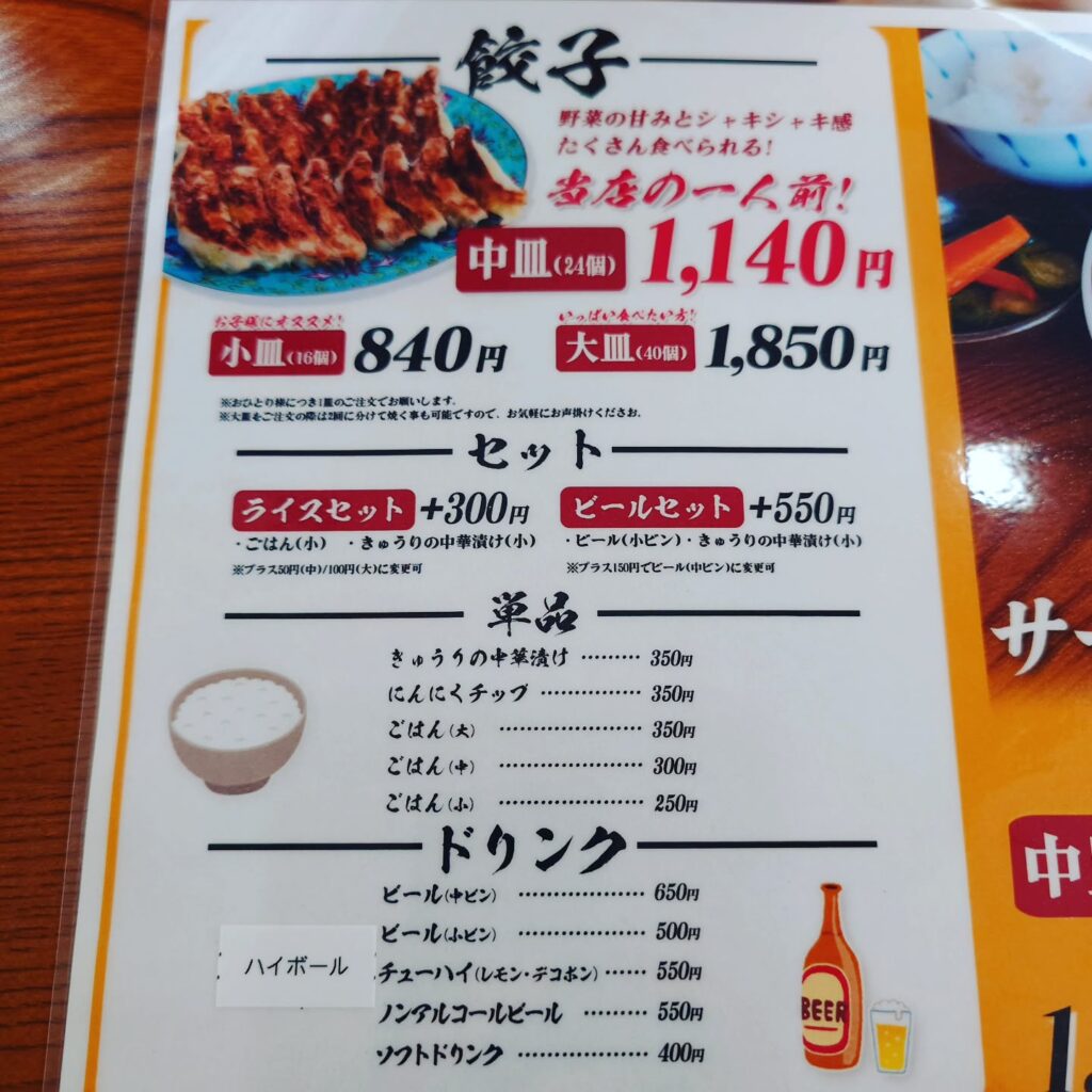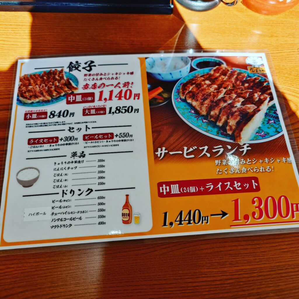 メニューを見ると餃子は、小皿(16個)、中皿(24個)、大皿(40個)と三種類あり、まさやの1人前は中皿とのこと。