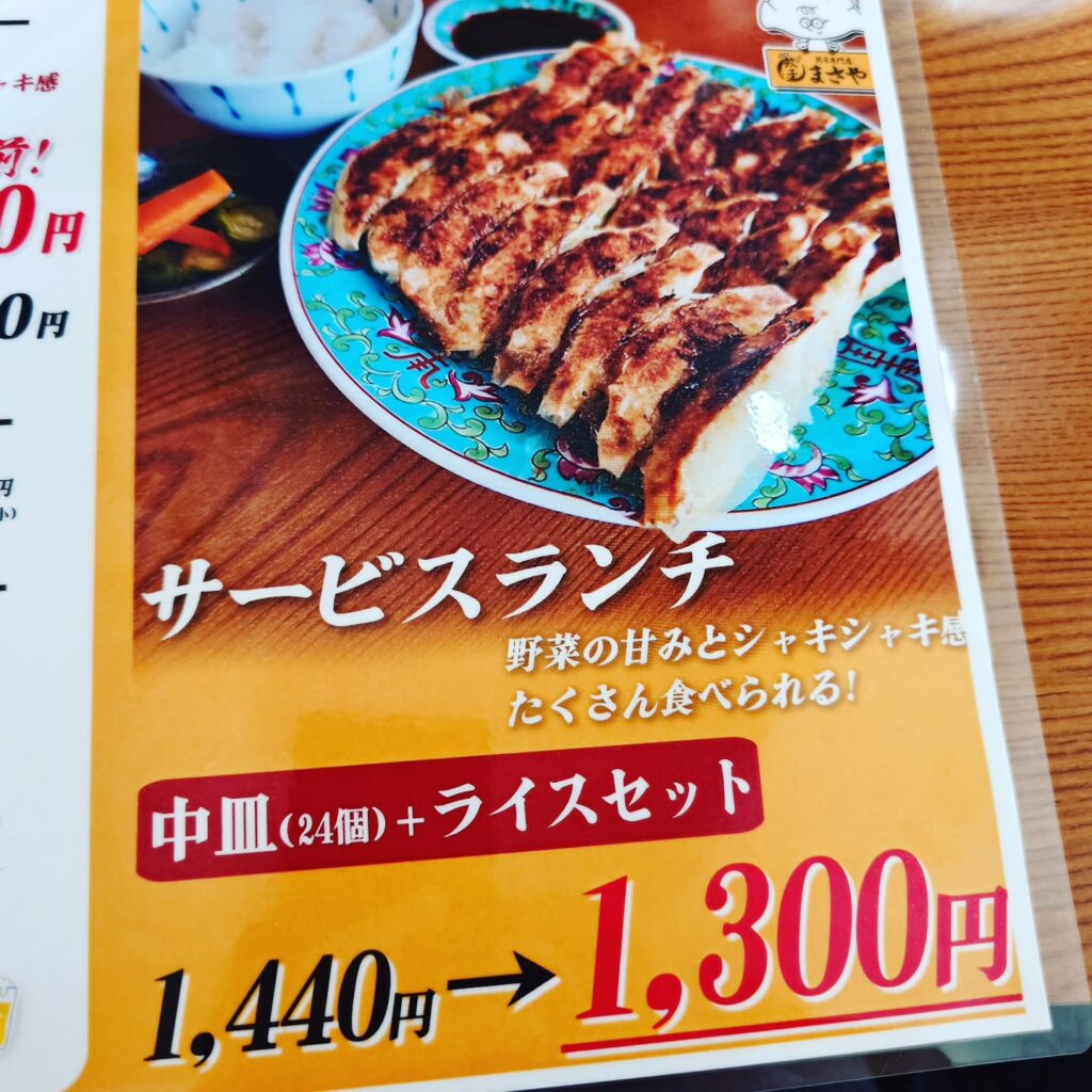 ●餃子専門店まさや 大阪今福鶴見: サービスランチ 中皿(24個)+ライスセット 1300円(税込み)