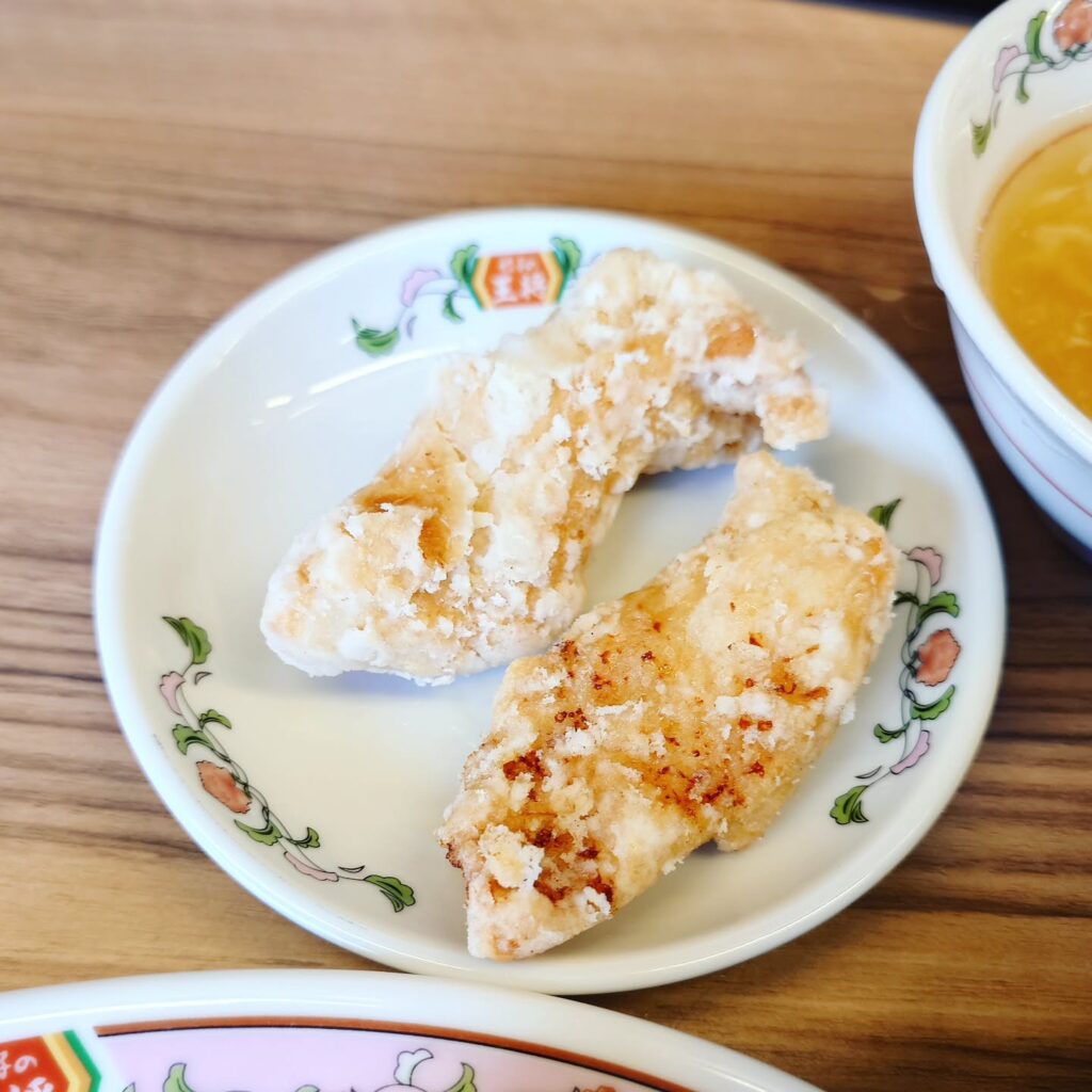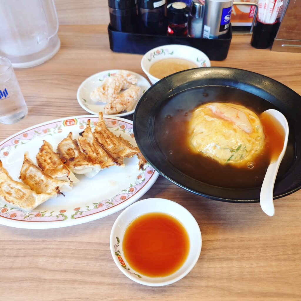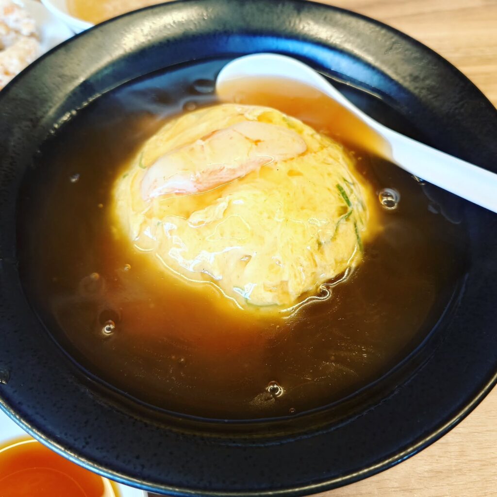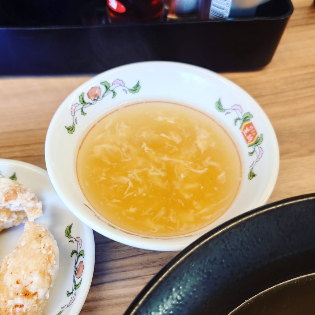 天津飯セットは、天津飯に餃子1人前、鶏の唐揚2ケとスープの魅力的なラインナップ。