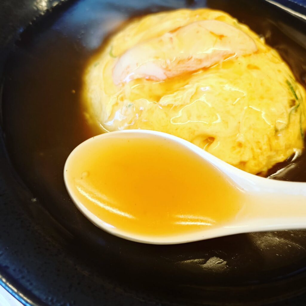 天津チャーハンの皿が平べったく白いのに対し、天津飯は黒いドンブリ。
