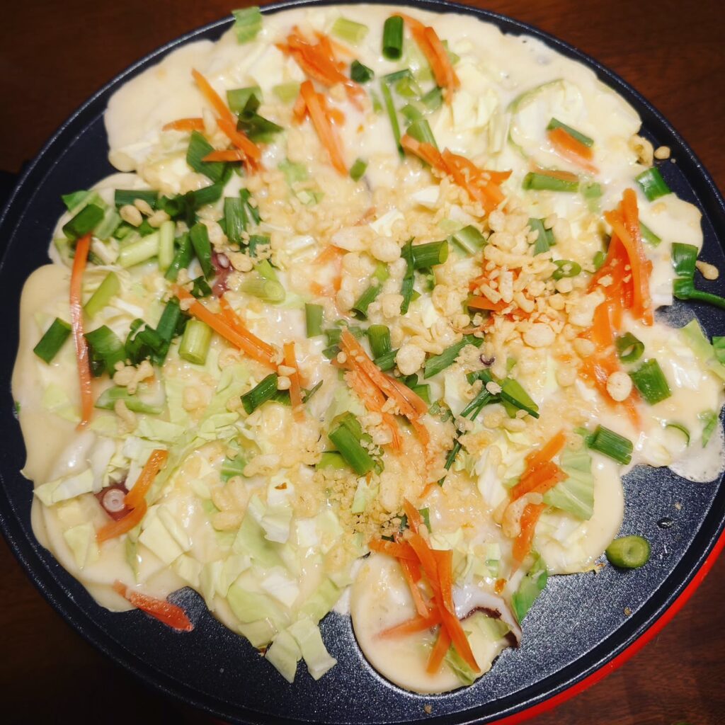鉄板に流した生地に、タコやキャベツ、ネギ、天かす、紅生姜などの具材を「放り込んで」いきます。