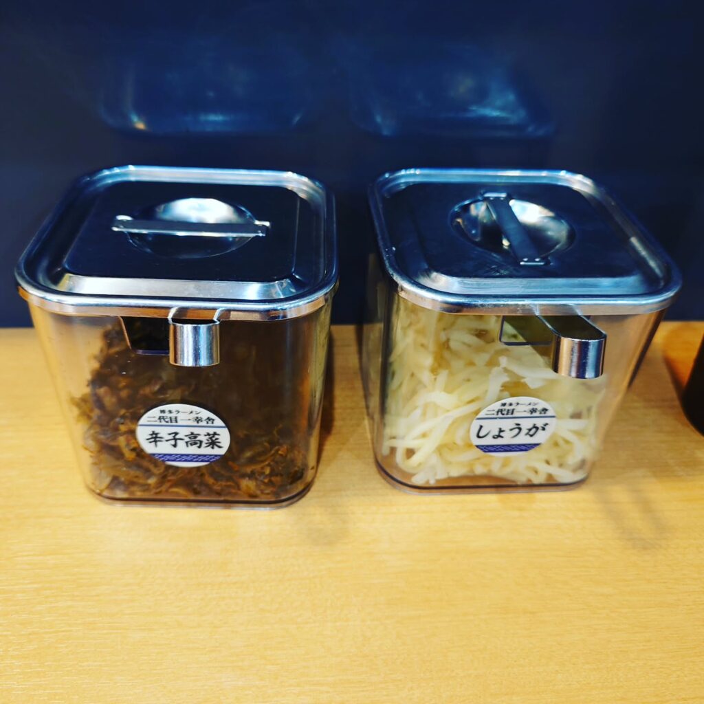 テーブル上にある無料トッピングの高菜は明太子ご飯に乗せました。