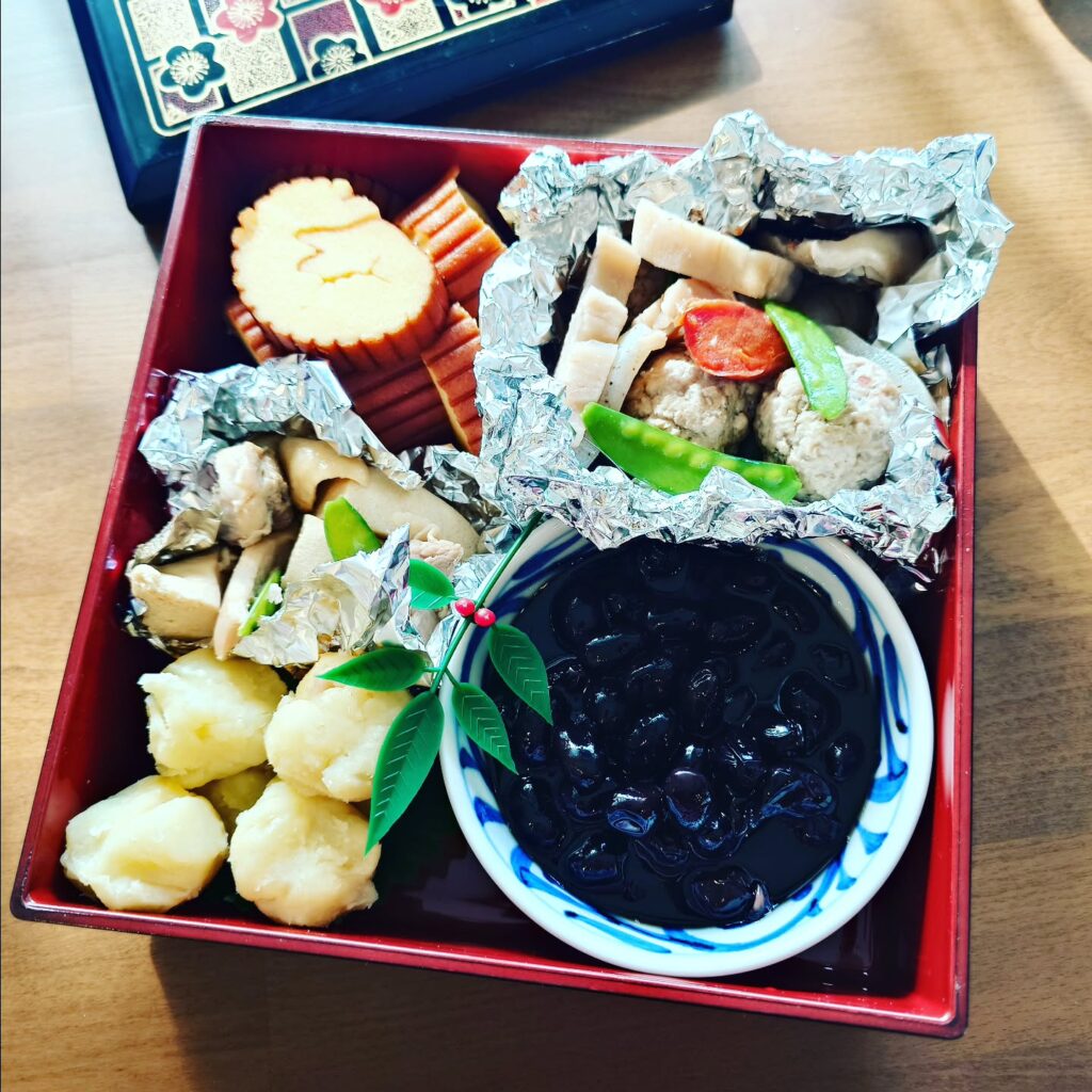 ●正月料理: 関西風雑煮、出汁漬け数の子、鯛の塩焼き、おせち料理、から揚げ、柿の葉寿司など