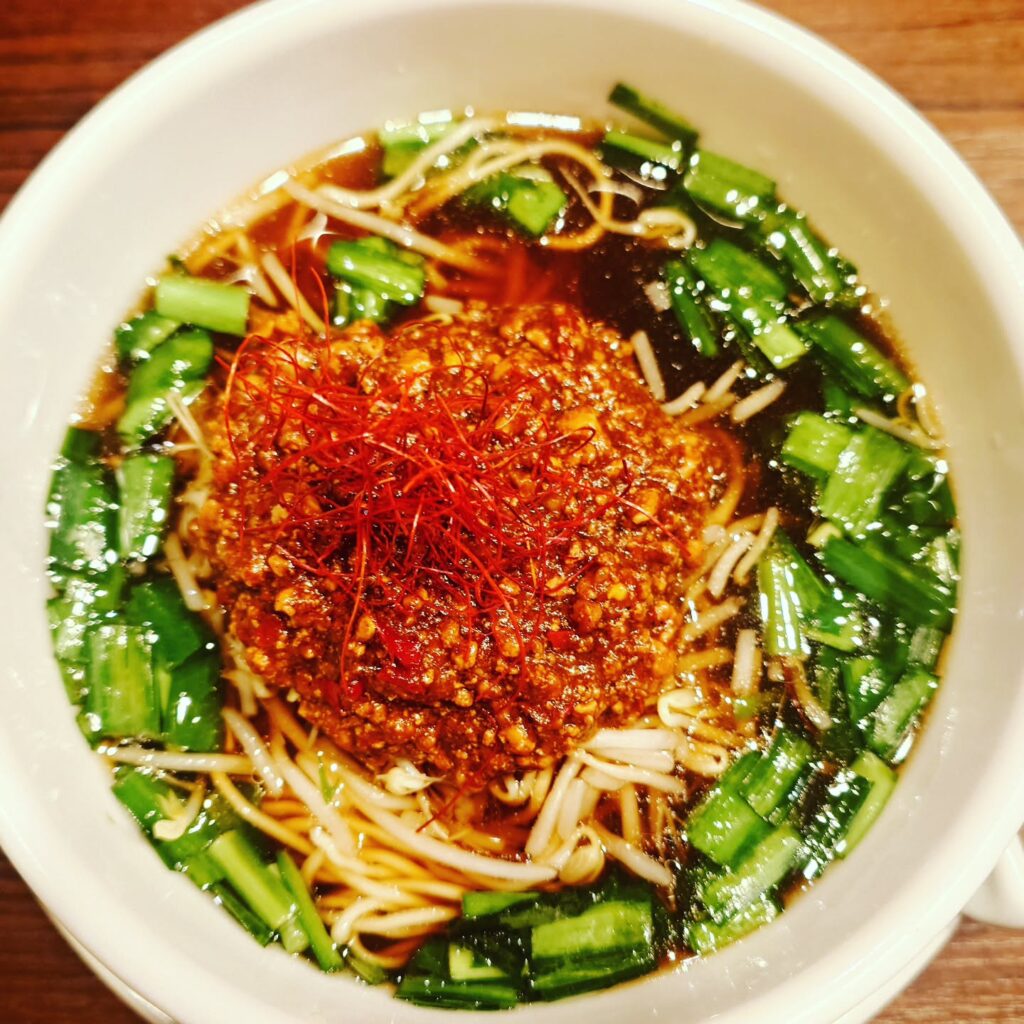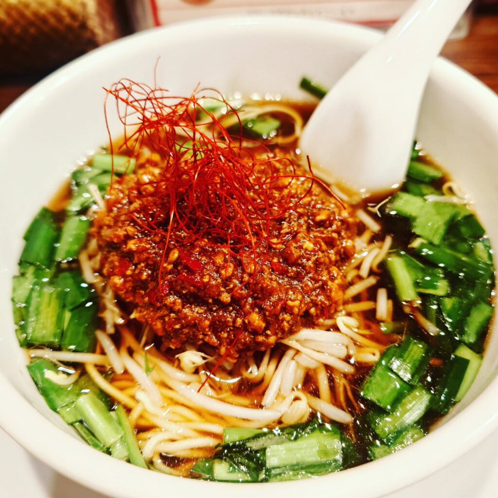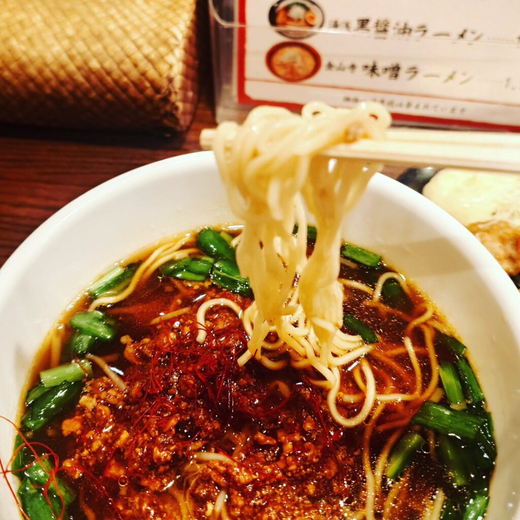 辛口の肉味噌とニラが台湾ラーメンの二大ポイントで、さらに糸唐辛子が存在感を出しています。