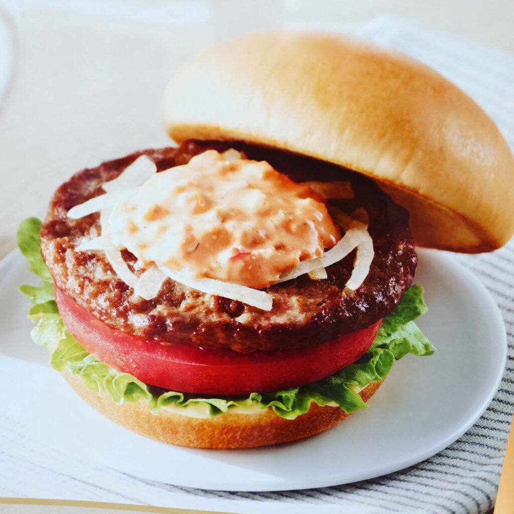 対して、今回の朝の野菜バーガーは、バンズ→オーロラソース→オニオンスライス→ハンバーグパティー→トマト→レタス→バンズの順番。