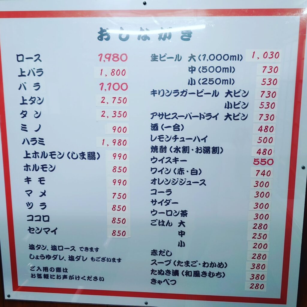 タン塩、上バラ、ロース、ハラミ、ミノ。