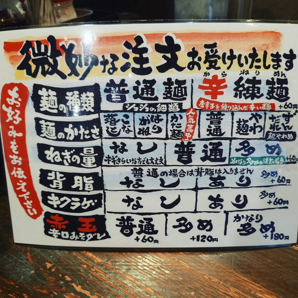 麺は普通麺、麺のかたさはかた麺、ねぎは多め、背脂あり、キクラゲあり、とした。
