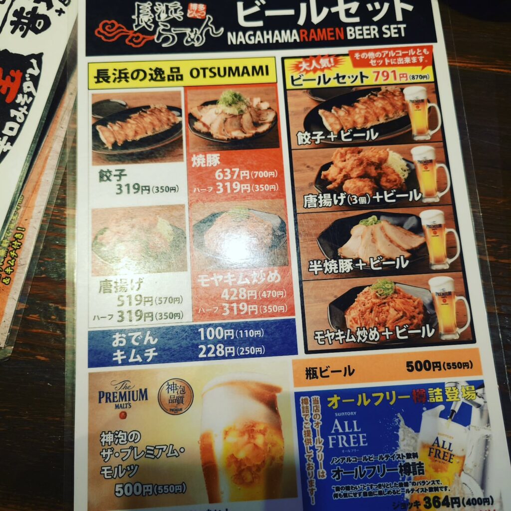 ●長浜らーめん本店 和歌山市: ビールセット(餃子+生ビール) 791、ラーメン