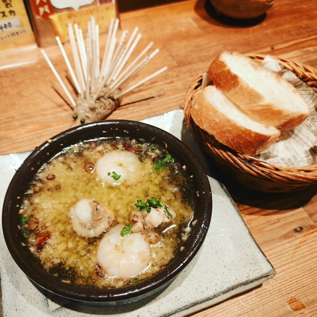 そしてアヒージョ、パンと一緒に。
